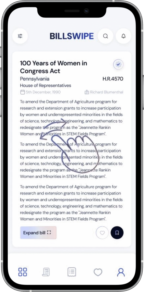BillSwipe makes understanding legislation as simple as swiping. See what’s being proposed, vote how you feel, and watch democracy in motion.
